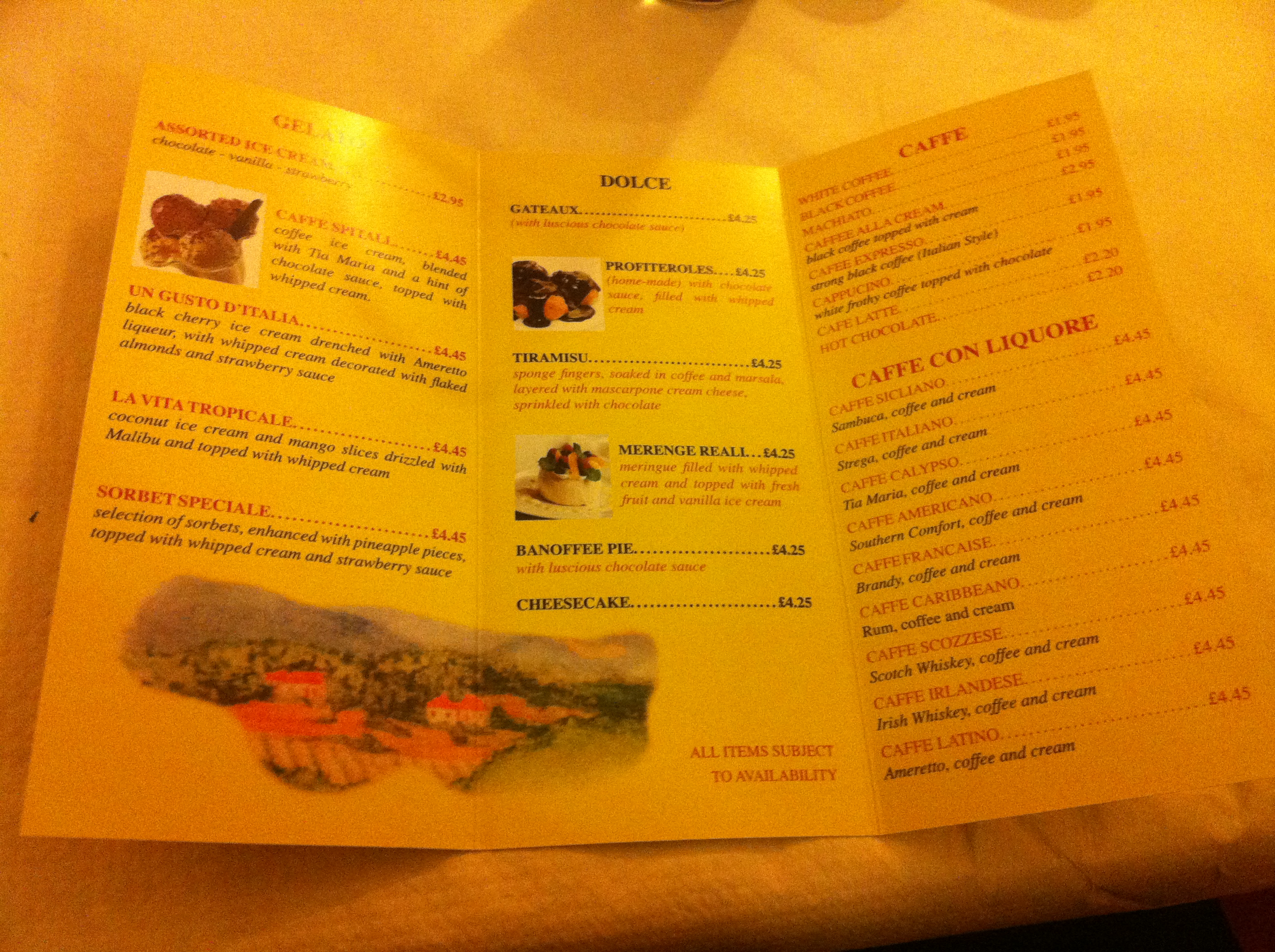 It would have been rude not to look at the dessert menu when it was offered…but here we faced a further disappointment when presented with a card with photographs that suggested that the tiramisu, banoffee pie, cheesecake and other desserts (most of which were not Italian) were bought in.