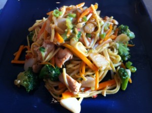Our first meal was “cheeky chicken chow mein with oyster sauce and water chestnuts”. Plenty of chopping to do here, with the broccoli, garlic, chilli, carrot, spring onion, water chestnuts, chicken and ginger, but the actual cooking time was short. The marinade for the chicken thighs (garlic, soy sauce, ginger, red chilli and tomato puree) was delicious, and the chicken thighs meaty and tender…but when a recipe says “leave it to marinade for a bit”…how long is “a bit”?
