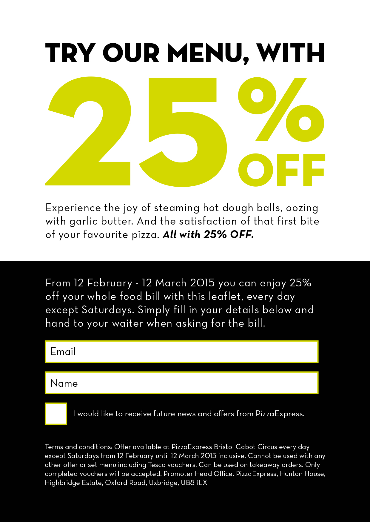Until March 12th, 2015, diners can enjoy a 25% discount on their food bill by clicking on the image below and printing the voucher. The voucher is valid for any day of the week bar Saturdays, and is only available at the new Cabot Circus restaurant. The voucher cannot be used in conjunction with any other offer or set menu, and cannot be used when paying with Tesco ClubCard vouchers, but is able to be used on takeaway purchases.
