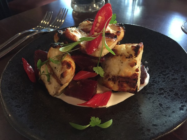 My sister chose the vegetarian option from the small plates menu to start: a dish of halloumi, salt roasted beetroot and pickled chilli (£7). She was impressed with the presentation and was pleased to see a decent amount of the salty “squeaky cheese” on her plate, and the chillies, while pickled, still had a great kick. The earthiness of the beetroot paired well with the cheese, and wasn’t as salty as she was expecting – probably a good thing, with the halloumi alongside it.