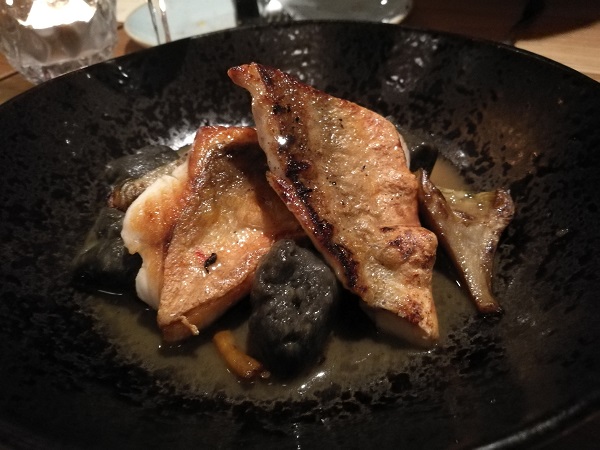 Course five was gurnard, accompanied with potato gnocchi, baby violet artichokes, wild mushrooms and a mushroom broth. Presentation-wise, I wasn’t convinced – it was all a bit black and gloomy. The Cornish gurnard was beautifully cooked and seasoned well, and the artichokes firm and full of flavour. The earthy mushroom broth had just a hint of something boozy – but the gnocchi were a bit of a let-down – the colour just didn’t appeal, and they were undercooked and a bit gluey and doughy.