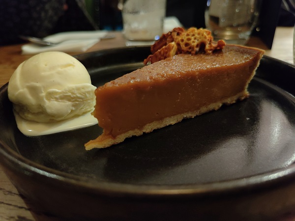 Dessert was another shared affair, and the salted caramel tart (£7.50) transported me back to memories of holidays in France with its thin, soft caramelised pastry and its subtly flavoured filling, almost jelly-like in its texture. With its scoop of milk ice cream and soft but chewy shards of honeycomb on the side, it was a winner all round.