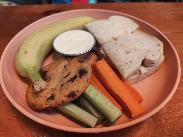 He declared the tuna sandwich to be “really good” and cleared his plate (cookie first, of course), apart from the banana, which we saved for later.