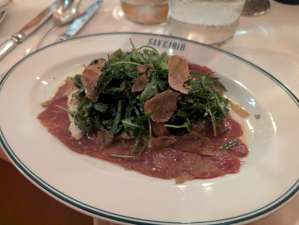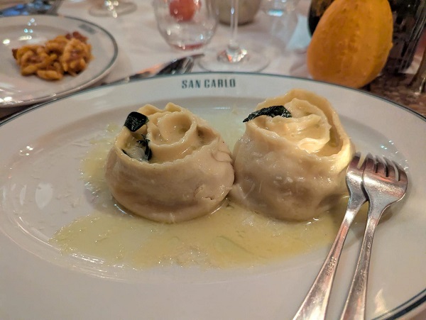 Meatier, but no more substantial necessarily, were the other two Antipasti dishes: Carpaccio di Manzo and Fichi e Culatello, respectively. Slices of cold raw beef (fillet, I presume) melt between the teeth with minimal chomping, set off by ceps, rocket and plenty of white truffle. Equally special was the latter plate: a curious piece of charcuterie from Bassa Verdiana, served with figs and a few more loose rocket leaves to highlight the innate sweetness and pepperiness of the pork. I would recommend searching this stuff out in your own time, as it seems this might be a bit of a one-off, rather exclusive treat for us so-called ‘influencers’. Assuming everyone at the table, save for a couple of designated drivers, was as keen on fine wine as I, I think it’s safe to say the Vermentino di Gallura (from Sardinia) worked as well for them as it did for me; robust enough to take on both meats without stripping our palates with tannin.