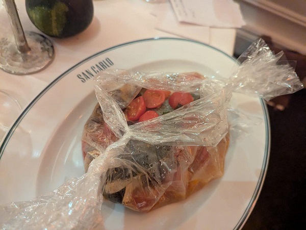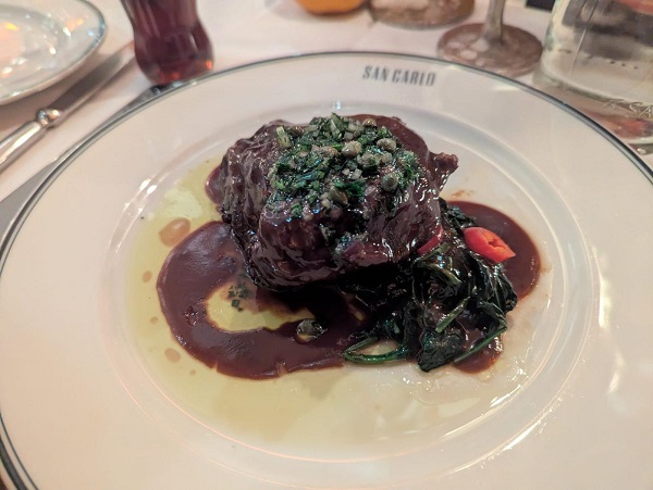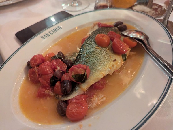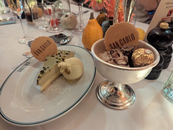Out come two more reds from the vineyards of Sardinia, along with the final savoury courses of the evening. Hefty chunks of braised ox cheek with spinach, gremolata, and other garnishes are the only non-Italian title on the menu; simply Beef Cheek & Spinach due to a minor error in the copywriting department. This melts away as expected, with plenty of secret nutrition provided by the non-fauna elements surrounding it. The Branzino al Cartoccio is a welcome, slightly lighter plate of food; seabass, cooked ‘en papillote’, with oodles of Mediterranean vegetables that sing the national flag’s colours as they escape the steam of their former home. We have been well fed indeed, but it’s not quite over yet.