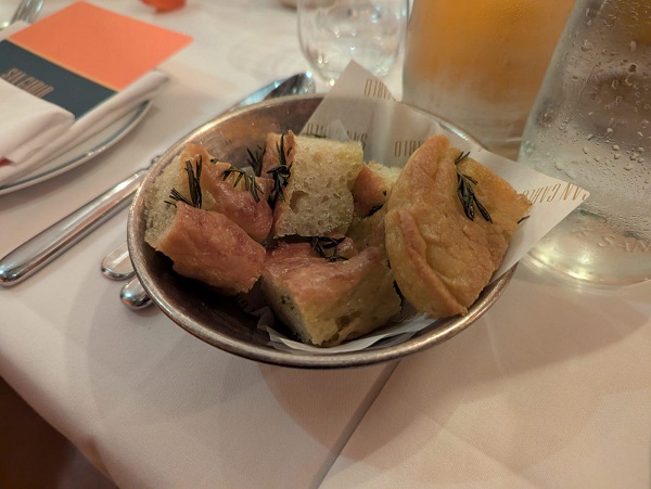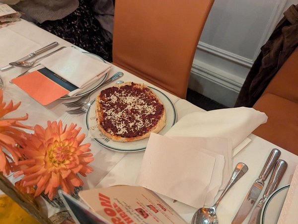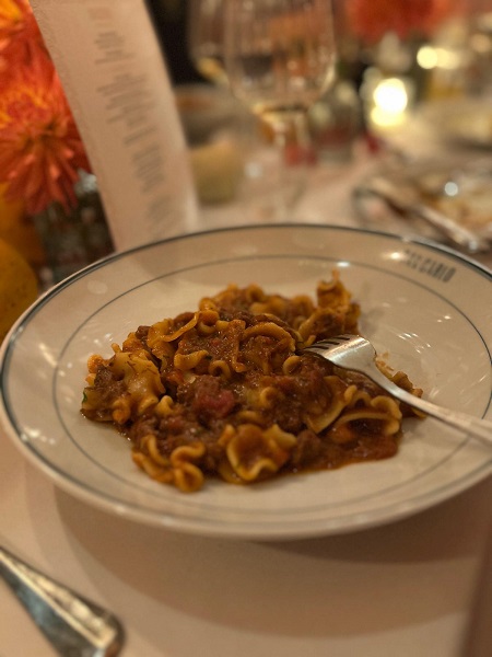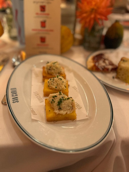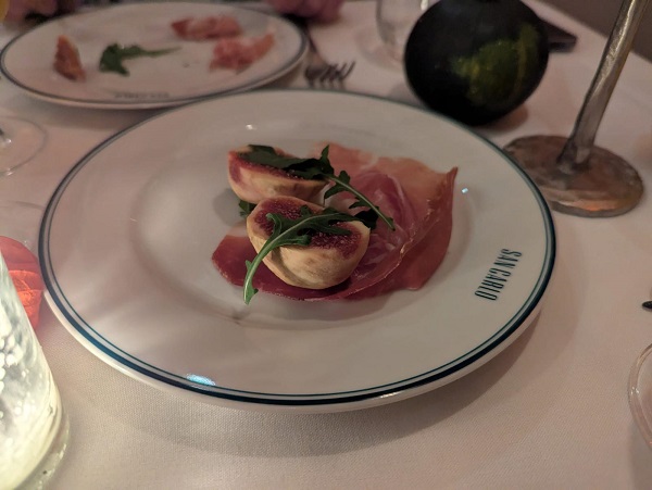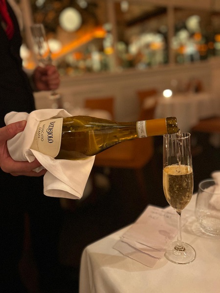 After our welcome Prosecco, James and I perched down at the very end of an extremely elongated table. The aforementioned Brazilian couple sat to my right guaranteed some wonderful conversation, and it was soon clear that the theme this evening was to be lashings of generosity, with extra truffle sprinkled on top. Sparkling white wines go best with salty things, I find, and one could do a lot worse than some freshly-baked focaccia and a couple of slices of a pizzetta covered liberally in ‘nduja. A good start, to quote the Spartans, I think to myself.