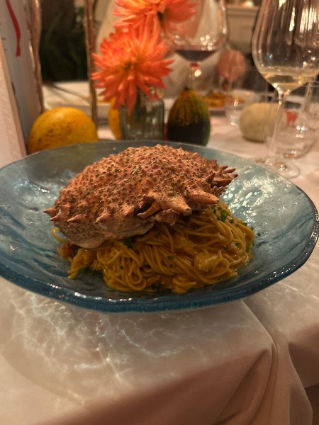 The next two wines were due to arrive with the penultimate course, so we made the previous ones last, alongside a couple of Birra Morettis, as further indulgence was provided with the third courses: the ‘Prima’ section. Belts loosening, we dive into some Mafaldine con Ragu di Manzo. Rustic pieces of short, slightly chewy pasta, woven through deeply marinated ox-tail, this took me back to the real thing, I believe, when I was a little heavier and ambling down the back streets of Sardinia years back. Alongside this was a vegetarian option: Cartellate Zucca e Tartufo; a genius creation of sizeable, silky pasta parcels filled with buttery pumpkin and pecorino. The word ‘moreish’ doesn’t do these delights justice, I assure you, and not just because the white truffle simply keeps on comin’! Finally, mercifully perhaps, but no less pleasantly, we taste the final pasta course. Theatrically presented, crowned with a spider crab carapace, the Tagliolini Grachio is possibly the richest thing so far. Brown crab meat, seasoned with a little saffron, tossed through velvety noodles of deliciousness, this is a straightforward take on a warming Trattoria-style dish that deserves to be on many a menu as Winter approaches.