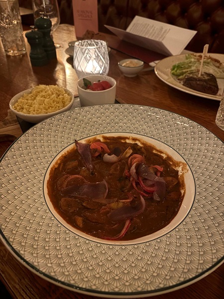 We spent a while deliberating with Matt about which dishes were worthy of writing about days later, and he suggested we go for a steak option and one of the new vegetarian dishes. This meant the 6oz Flat Iron (£23.95) for me, and the Chestnut Mushroom, Tomato & Spinach Curry (£17.50) for Helen. The service really is very good here, and we didn’t need to order any more drinks to know we were going to be sated and well-fed in time for a slightly cheaper round afterwards!