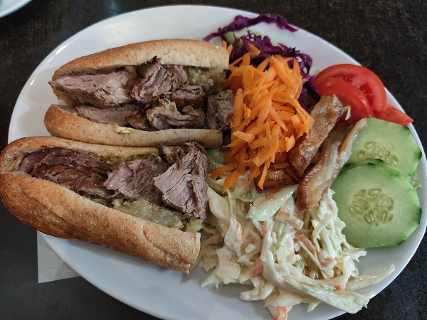 As if that wasn’t enough, the baguette also came with a vast amount of salad: tomato, cucumber, lettuce, red cabbage, grated carrot and an enormous pile of coleslaw. And that’s not all: they’d artfully arranged a few pieces of crispy pork crackling on top. A seriously hearty meal – and an impressive one for the price point.