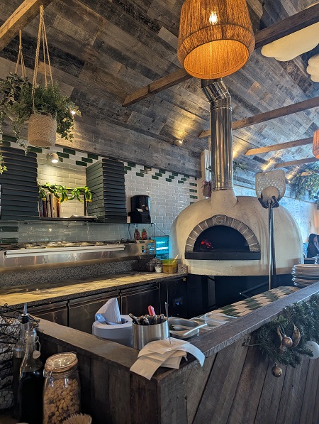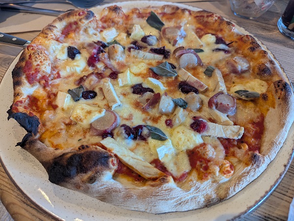 With the pizza oven constantly in view, we followed this with the Santa’s Treat pizza (£16.25), topped generously with roast turkey, pigs in blankets, mozzarella, cranberry sauce, Brie and sage. Festive without being gimmicky, the toppings were plentiful and the crust was beautifully chewy.