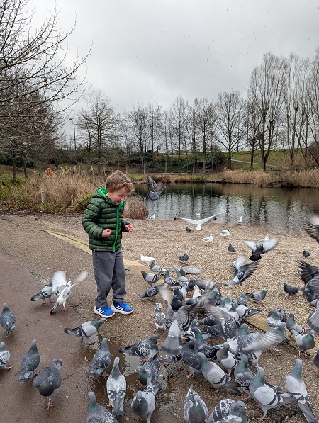 There’s a mosaic tunnel featuring artwork by local schools and numerous lakes for wildlife spotting (we spent a while watching a cormorant catching a fish for its lunch!) There’s even a “beach” by the largest lake: take a bag of bird seed (not bread) and you’ll be able to feed the wildlife while you’re there – including, to our son’s delight, an enormous flock of pigeons.
